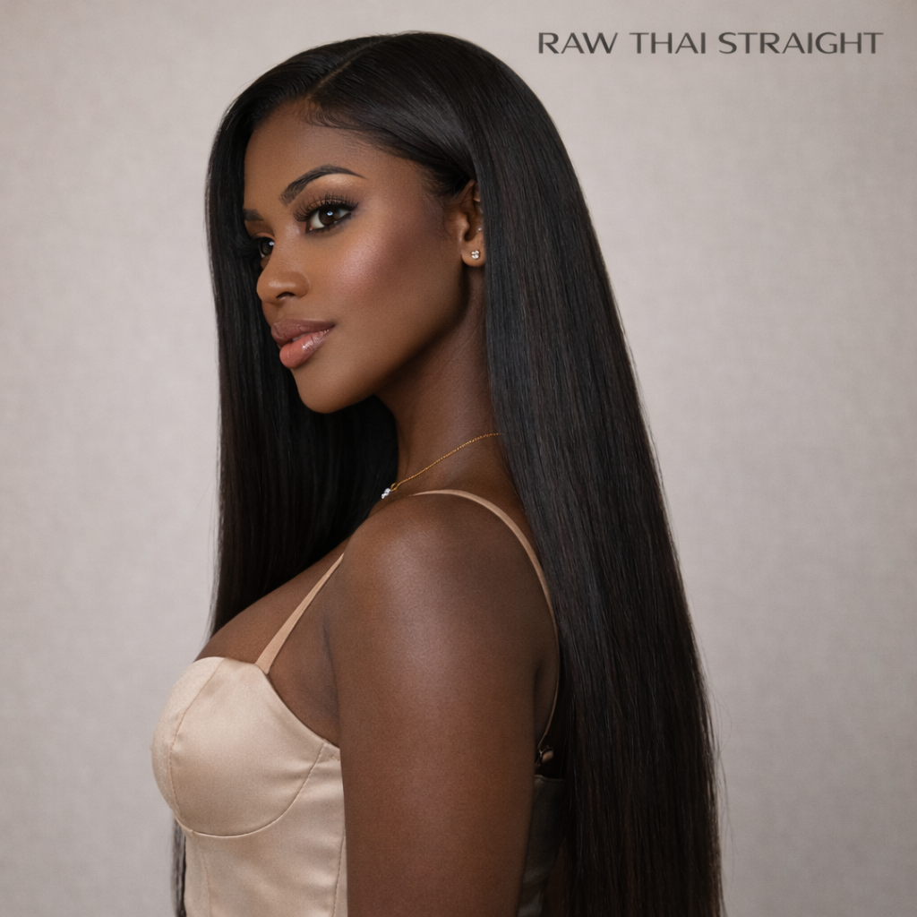 Our Raw Thai Straight hair is naturally smooth with a soft, airy feel and a healthy medium luster. Known for its lightweight movement and durability, this texture blends effortlessly, holds styles beautifully, and can be worn sleek or styled with heat while maintaining its natural flow and shine over time.
